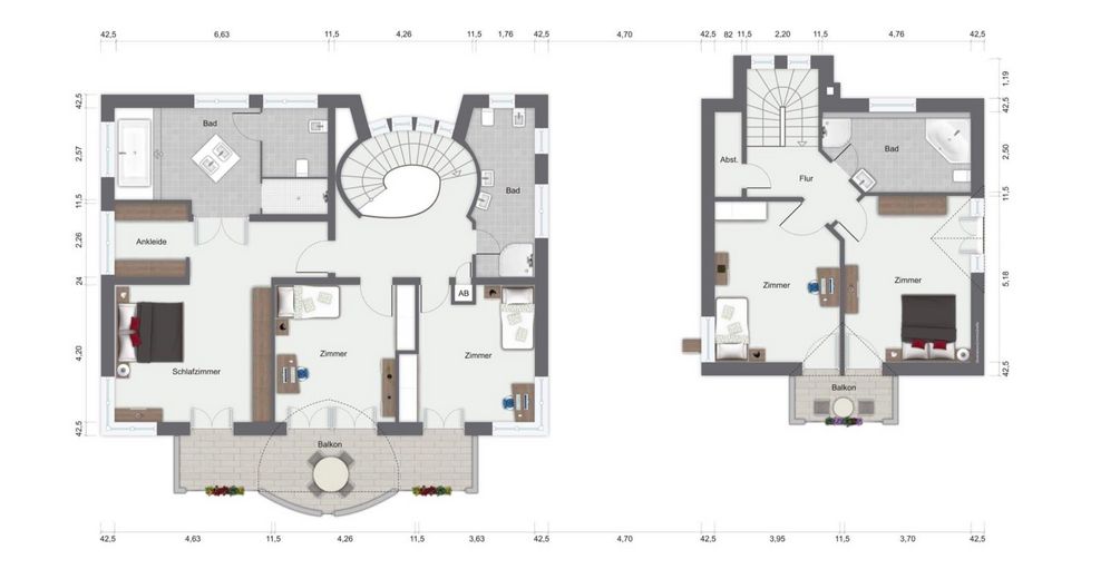 Zwei helle Zimmer mit Zugang zu einem sonnigen Südbalkon teilen sich ein hochwertig ausgestattetes Duschbad mit Doppelwaschbecken und Bidet.