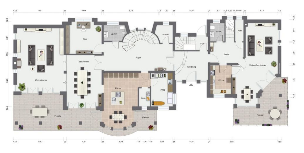 Diese außergewöhnliche Villa vereint zeitlose Eleganz mit modernem Wohnkomfort. Das Anwesen ist in zwei vollständig voneinander unabhängige Wohnflügel gegliedert und bietet dadurch vielseitige Nutzungsmöglichkeiten – ideal für Mehrgenerationenwohnen, Wohnen und Arbeiten oder eine Kombination aus Eigennutzung und Vermietung.