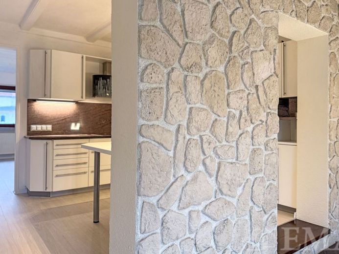 Im Erdgeschoss befinden sich ein Wohnzimmer mit dekorativem Kamin und Zugang zur Westterrasse, ein großes Esszimmer, eine moderne Küche mit Einbauküche sowie ein Flur. Im Flur führt eine Holztreppe in das Dachgeschoss und im Esszimmer in den Vollkeller. Die Wohnfläche im Erdgeschoss beträgt ca. 58 m².