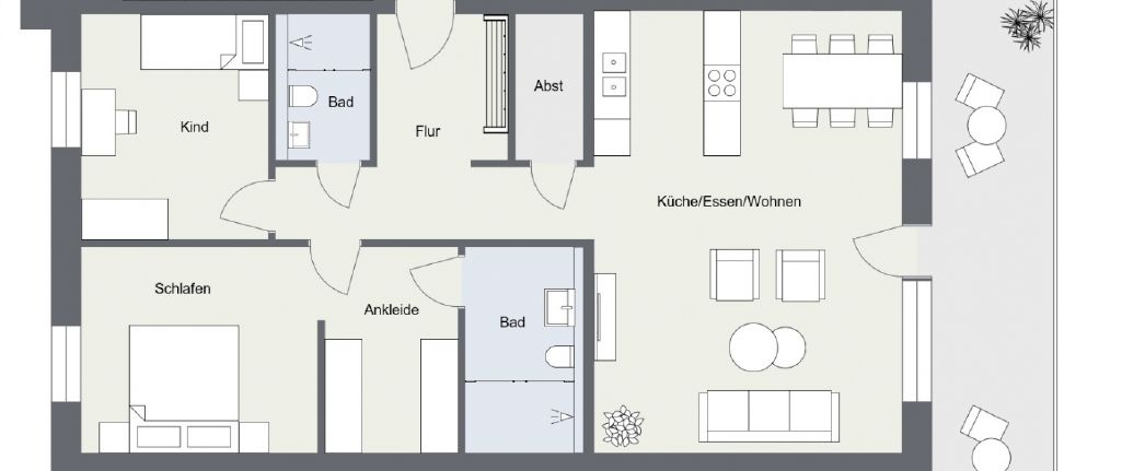 Die Wohnung besteht aus einem offenem Koch- / Wohn- und Esszimmer, 2x Schlafzimmer, Gäste-WC , Bad mit bodentiefer Dusche und großer Sonnenterrasse. Zusätzlich hat jede Wohnung eine Abstellkammer & separaten Kellerraum