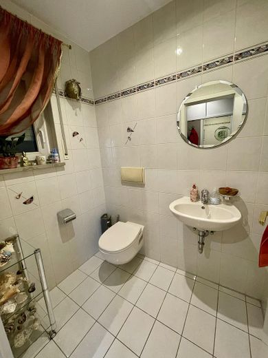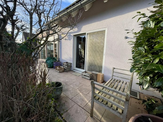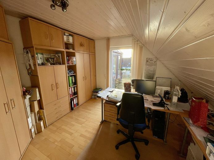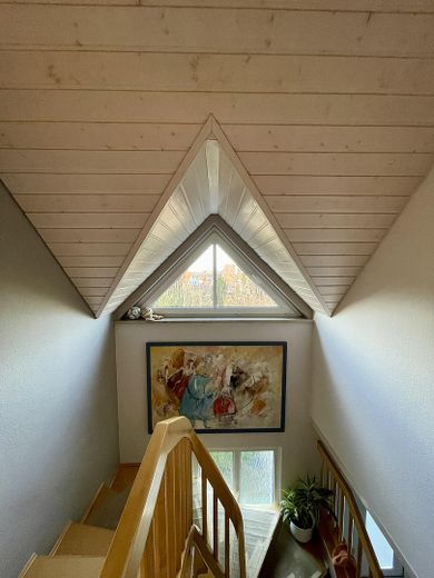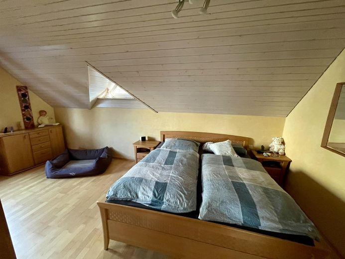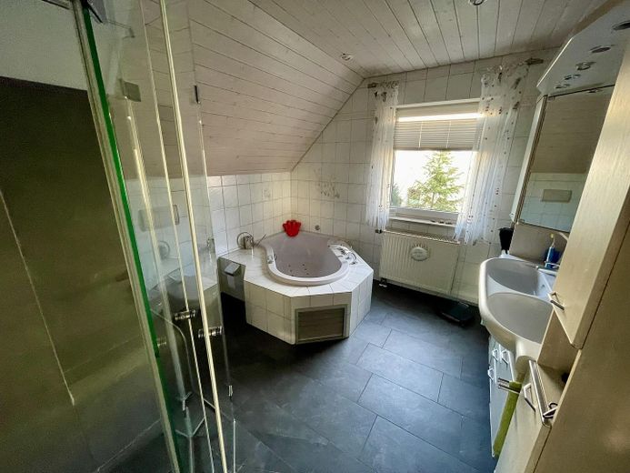 Im Obergeschoss befinden sich drei gut geschnittene Zimmer sowie ein modernes Badezimmer mit freistehender Whirlpoolwanne und neu renovierter Dusche. Ein besonderes Highlight ist die großzügige Dachterrasse, die zusätzlichen privaten Freiraum bietet.