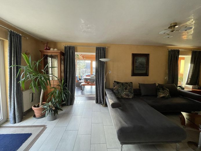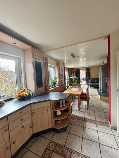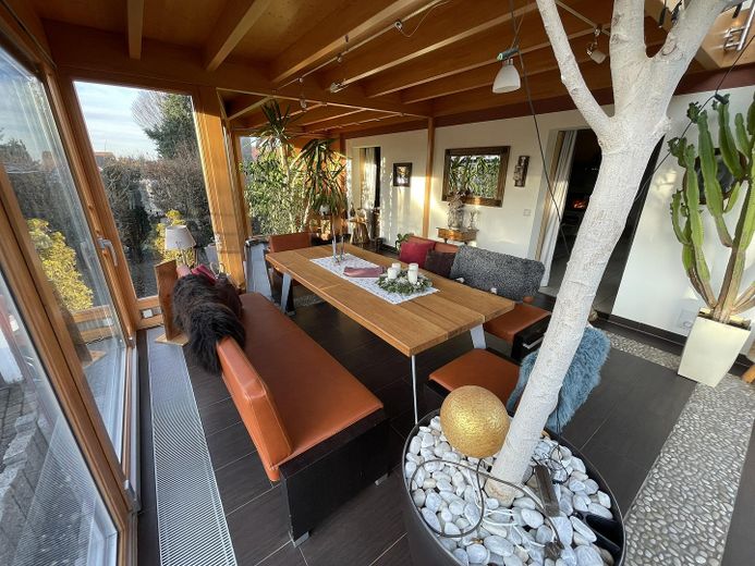 Der Mittelpunkt des Hauses ist das sehr geräumige Wohn- und Esszimmer mit offenem Übergang zur Küche. Der hochwertige Speckstein-Kaminofen sorgt hier für eine behagliche Atmosphäre. Von diesem Bereich aus gelangen Sie direkt in den beeindruckenden Wintergarten, auf die Terrasse sowie in den weitläufigen Garten – ideal für entspannte Stunden mit Familie und Freunden.