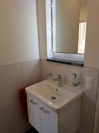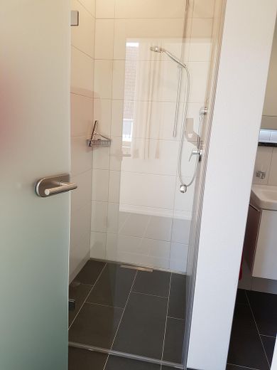 •Hochwertiges Bad mit bodengleicher Dusche, Waschbecken und Toilette.