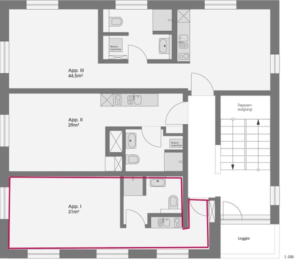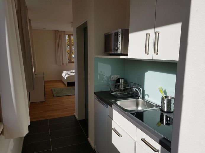 Die Wohnung hat eine Größe von ca. 31m² und befindet sich im 1. Obergeschoss eines Niedrigenergie-Mehrparteienhau­ses (KfW 55).
