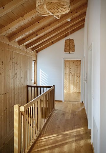 Das Obergeschoss hat in allen 3 Räumen hohe Decken mit Holzbalkendecke, zwei davon haben bei gutem Wetter Blick auf das Alpenpanorama. Hier befindet sich auch ein großes Badezimmer mit Badewanne und Dusche.