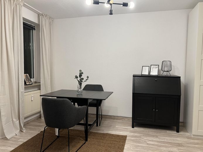 Die Wohnung verfügt über ein neues Bett mit hochwertiger Matratze, einen Essbereich mit Tisch und Stühlen, einen geräumigen Kleiderschrank, einen bequemen TV-Sessel sowie einen praktischen Schreibtisch – ideal für Homeoffice oder Studium.