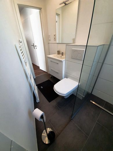 Das neue Badezimmer verfügt über ein Fenster, eine begehbare Dusche mit Rain-Shower und einen Handtuchheizkörper.