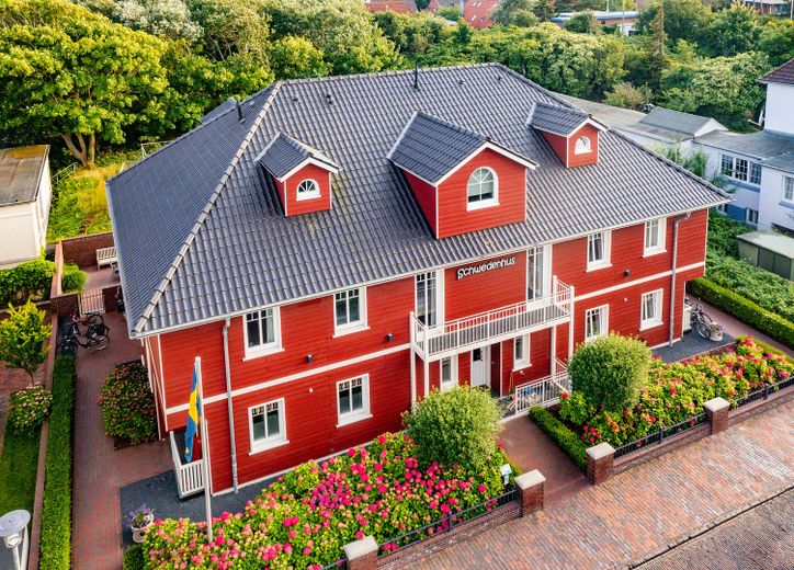Das Reihenhaus in rot gehaltener Holzoptik ist im Jahre 2015 neu erstellt worden. Jede Wohnung wurde individuell geplant und urlaubsgerecht eingerichtet und bietet ausreichend Raum für Großfamilien oder zwei Familien. Es finden insgesamt bis zu 12 Personen Platz.