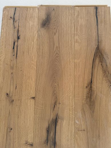 - Hochwertige Eichenholzdielen und großformatige Steinzeugfliesen
