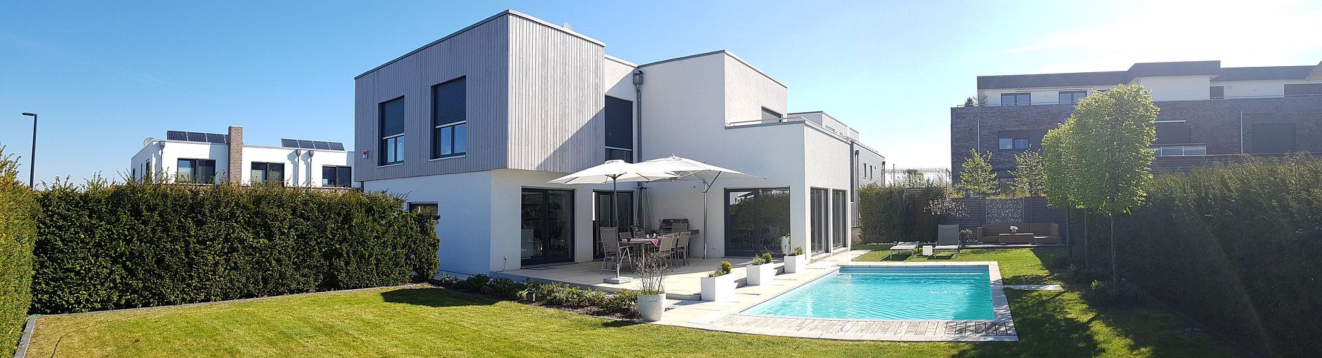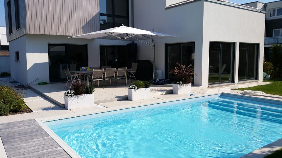 Für Wärme sorgt eine der modernsten Wärmepumpen die erst im Jahr 2025 in Betrieb genommen wurde. Ein großer Gartenbereich mit beheizbarem Pool (8 x 4 Meter), Terrasse und Holzdeck lässt keine Wünsche offen. 2 PKW-Stellplätze und eine Wallbox-Vorbereitung sind ebenfalls vorhanden.