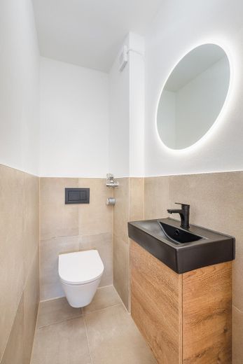 Das großzügige Badezimmer wurde modern und komfortabel gestaltet. Ein besonderes Highlight ist der barrierefreie, fugenlose Übergang zur Dusche, der sowohl optisch als auch funktional überzeugt. Die großzügige Regendusche sorgt für hohen Duschkomfort. Zudem verfügt das Bad über zwei hochwertige Waschtische, einen beleuchteten Spiegel sowie einen Waschmaschinenanschluss im großen Badezimmer. Der hochwertige Bodenbelag fügt sich harmonisch in das Gesamtbild ein.