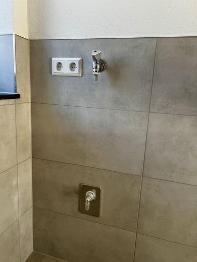 - Gefliestes Tageslichtbad mit ebenerdiger Dusche, WC, Handtuchheizkörper und Waschmaschinenanschluss