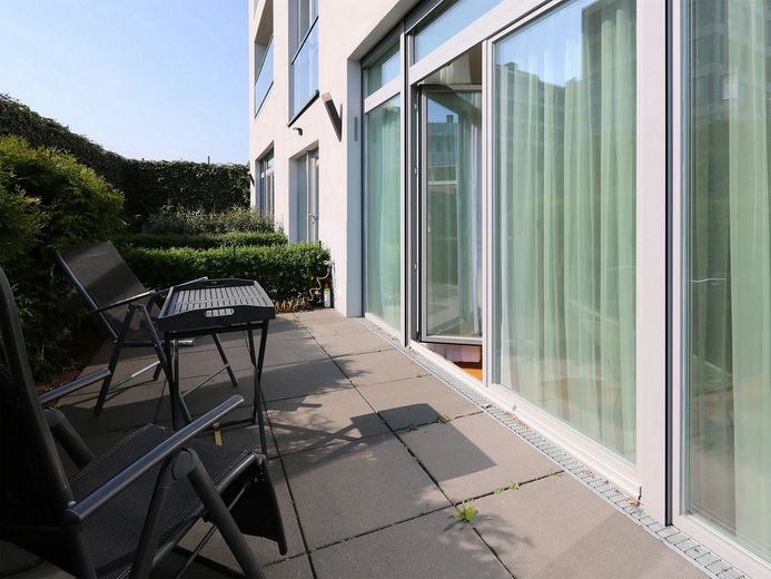 Diese moderne und schöne Wohnung mit einem Schlafzimmer befindet sich im Erdgeschoss in einem ruhigen, sicheren Gartenhof. Die gesamte Wohnung verfügt über Erker bis zur Decke sowie elektrische Jalousien und Holzböden für eine warme Atmosphäre. Genießen Sie die geräumige Terrasse, die Sie vom Wohnbereich aus betreten können und die Sie sich mit der voll ausgestatteten offenen Küche teilen.