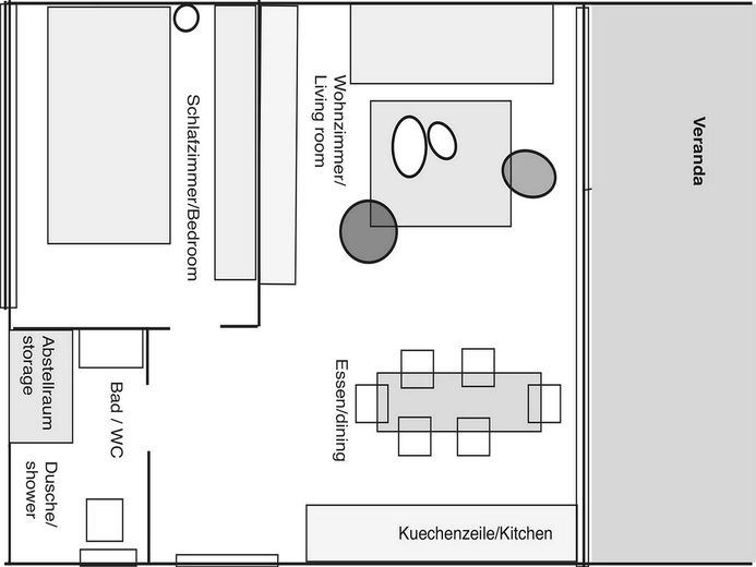 Die moderne Küche ist mit allen modernen Geräten ausgestattet, darunter ein Induktionsherd, ein Backofen, eine Kaffeemaschine, ein Wasserkocher und ein großer Kühlschrank. Der große, hölzerne Esstisch bietet Platz für bis zu sechs Personen. Der gemütlich gestaltete Wohnbereich lädt zum Entspannen oder zum Anschauen von Filmen auf dem Smart-TV-Flachbildschirm ein. Das Schlafzimmer bietet einen großen Schrank mit Spiegeln und ein bequemes Doppelbett für einen ruhigen Schlaf. Das Badezimmer hat eine begehbare Regendusche, ein großes quadratisches Waschbecken und eine Waschmaschine.
