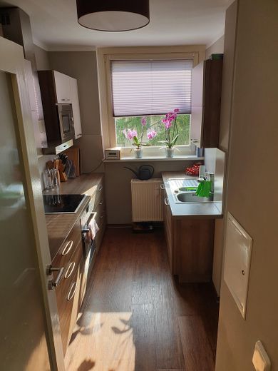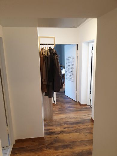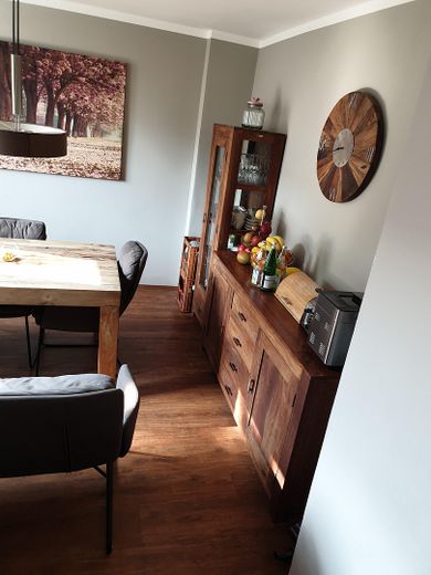 Die Wände in der kompletten Wohnung wurden glatt verspachtelt und gestrichen (keine Tapete). Die Bäder sind Deckenhoch gefliest. In der Küche ist hochwertiges Vinyl als Bodenbelag verklebt worden. Der restliche Bodenbelg ist hochwertiges Langdielen Laminat in dunkler Holzoptik.