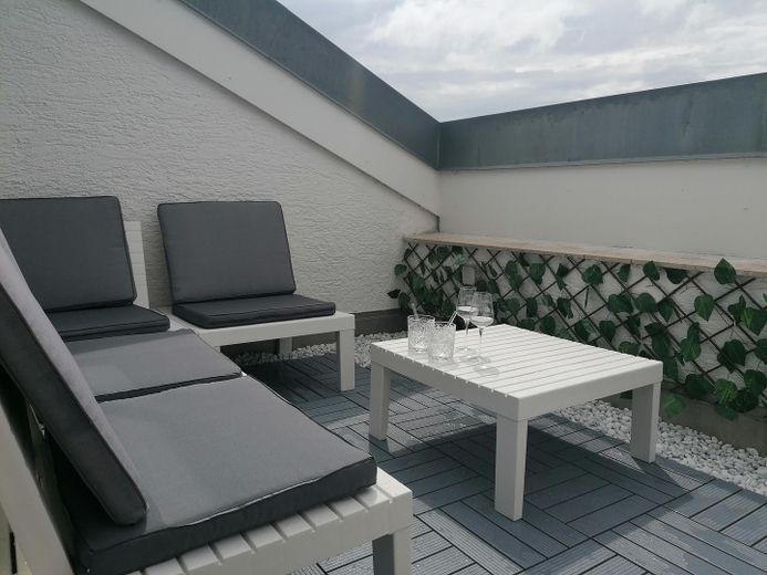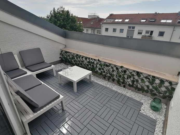 Die Wohnung besticht durch ihre helle, freundliche Atmosphäre und ihr modernes, designorientiertes Interieur. Besonders hervorzuheben ist die außergewöhnlich große, sonnige Dachterrasse – ein perfekter Ort zum Entspannen oder Arbeiten im Freien.