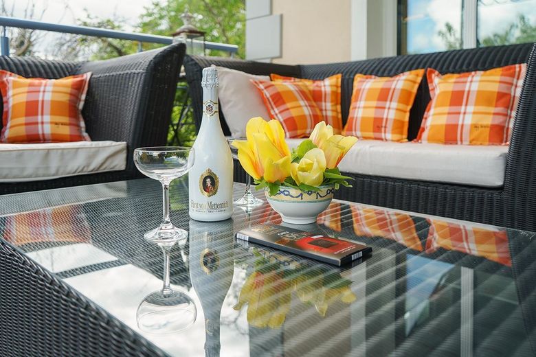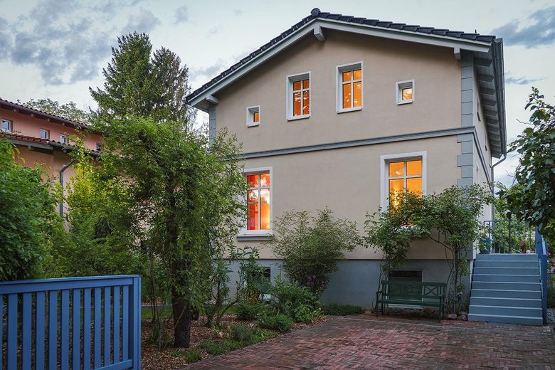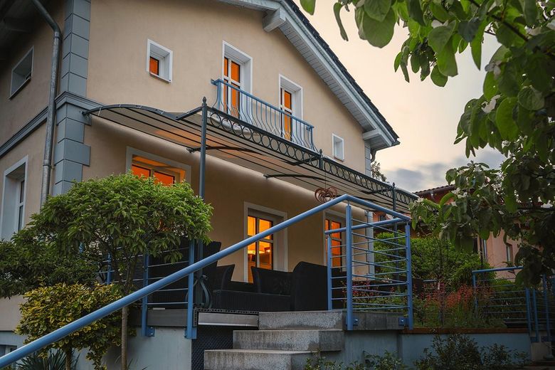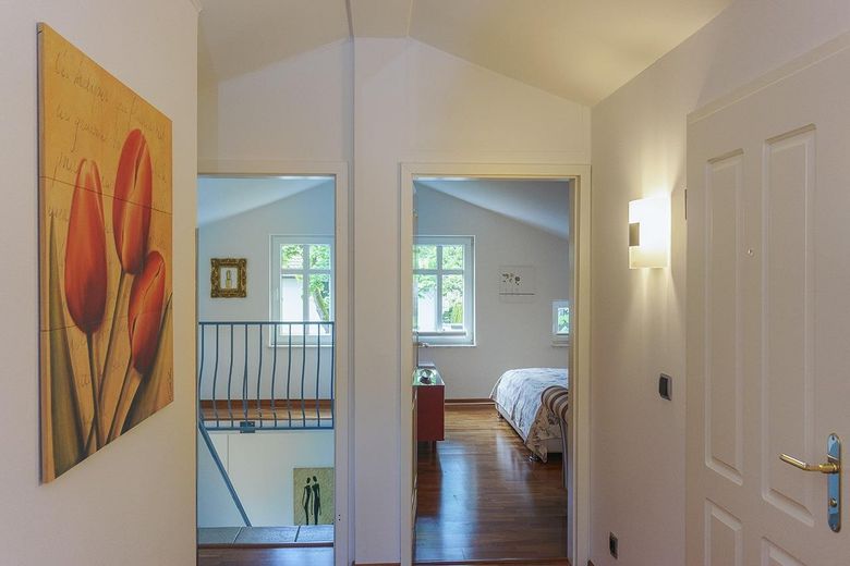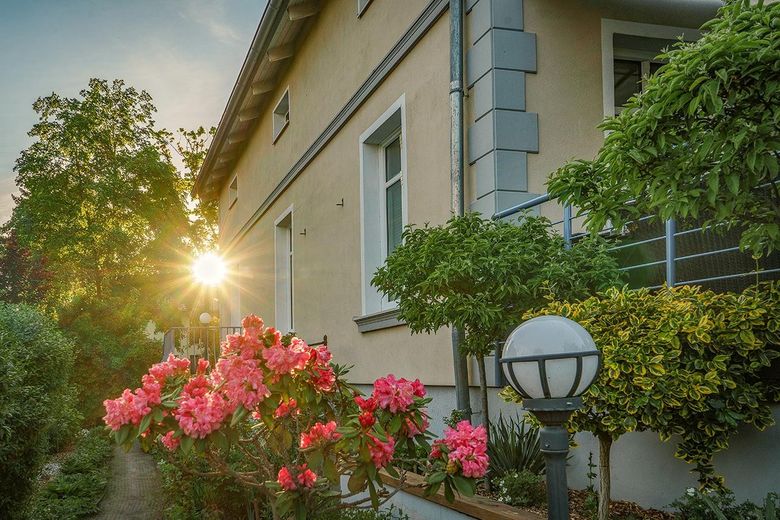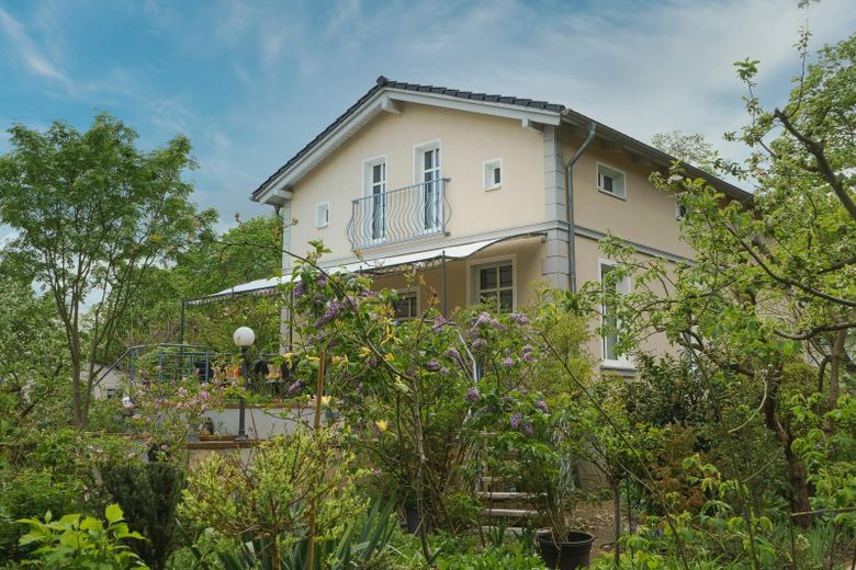 Ensemble- denn es sind im Grunde genommen gleich mehrere hochwertige Gebäude und einzelne Bereiche, die um einen privaten Hofbereich angesiedelt und so miteinander verbunden sind. Durch die optische Gestaltung wie Dachform, Farbgebung, Terrassenüberdachungen (Unopiu) etc. wird ein mediterranes Flair erzeugt. Die Gebäude sind wie Geschwister und bilden unter Einbeziehung des Gartens ein schönes Gesamtbild mit individuellen Nutzungsmöglichkeiten.