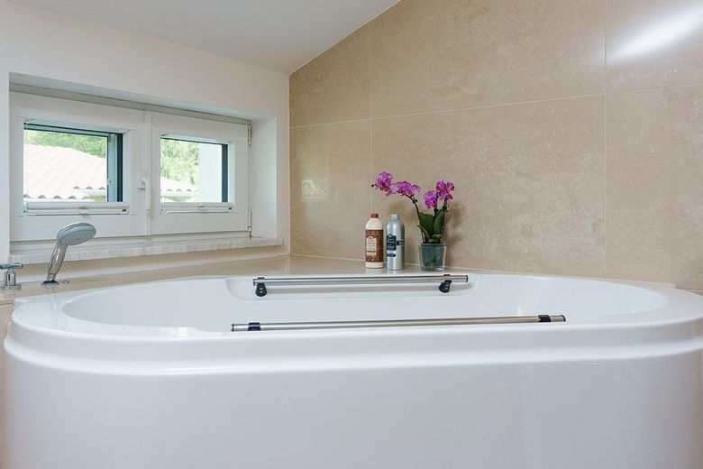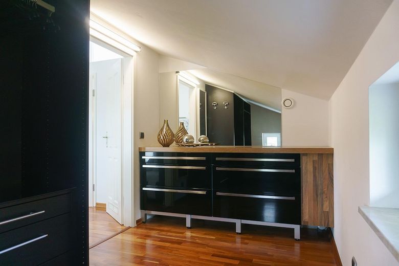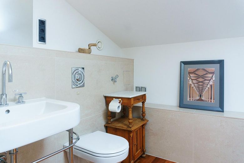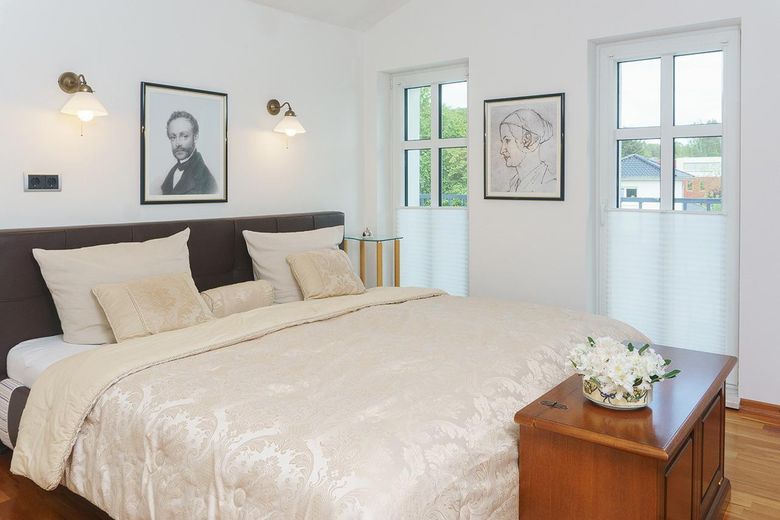 Im Obergeschoss gibt es zwei Schlafräume mit Ankleidezimmern und ein Wannenbad.