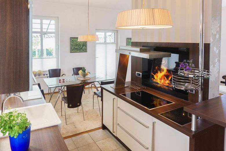 Das Treppenhaus ist ein Atrium mit Galerie und im Erdgeschoss liegt eine offene Küche mit angrenzendem Essbereich und dem Wohnraum als zentralen Punkt. Von hieraus hat man Zugang zur großen Ost-/Süd-Terrasse und auch zu den Quittenbäumen , Stufenbeeten und dem Grillbereich mit dem Quellstein für die Vögel in Mitten der Seerosen und dem Garten.