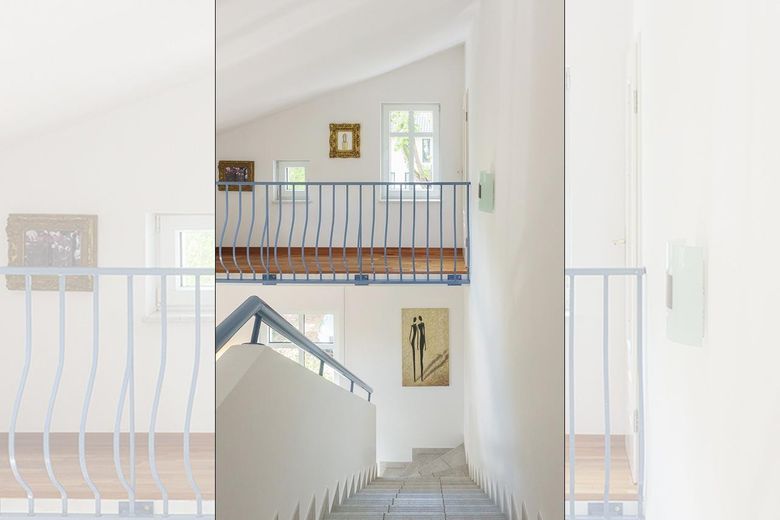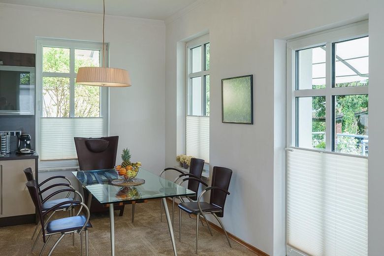 Seitlich im Erdgeschoss ist separat ein kleiner Raum Büro/Schlafzimmer mit Einbauschränken und Duschbad angeordnet. Durch die hohen, den Berliner Altbauten nachempfunden, aber technisch sehr hochwertigen Fenstern und die Deckenhöhe von 3 m wird ein helles luftiges Raumgefühl erzeugt.