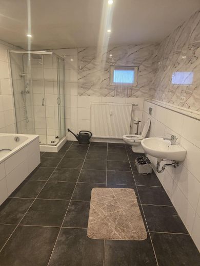 Helles, großes Badezimmer mit Dusche und Badewanne sowie WC