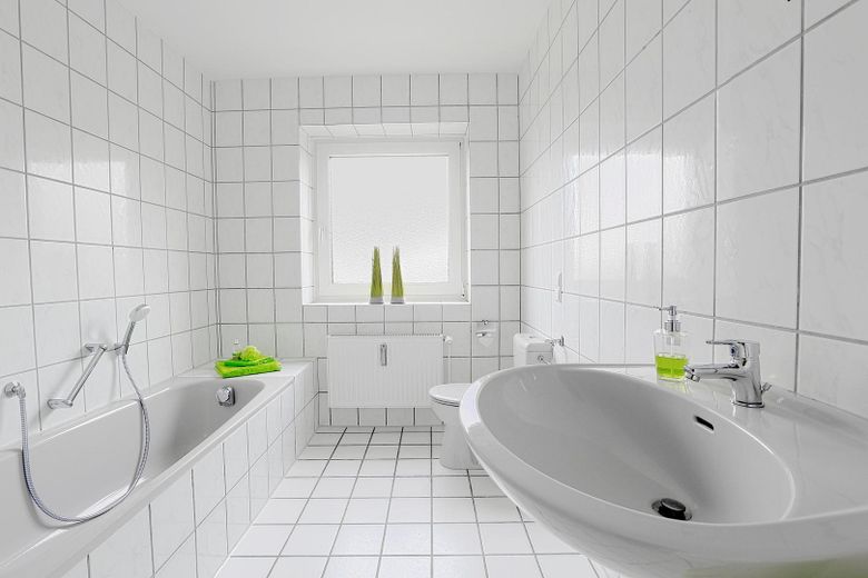 •Badezimmer mit Fenster, Badewanne und Dusche