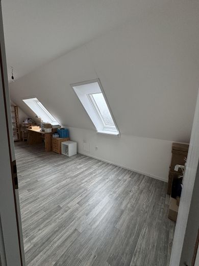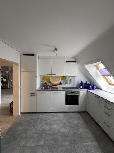 Das Herzstück der Wohnung ist die große, einladende Essküche, die reichlich Platz für gemeinsame Kochabende und familiäres Beisammensein bietet. Durch die Aufteilung auf zwei Ebenen (Maisonette) entsteht eine angenehme Trennung zwischen Wohn- und Schlafbereichen, was für eine besonders luftige und private Atmosphäre sorgt.