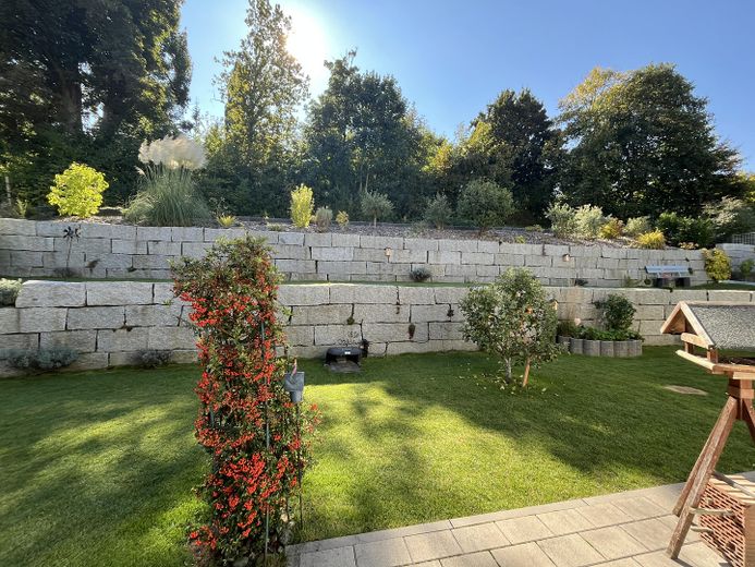 Der Garten ist hochwertig geplant und liebevoll gestaltet, der hintere Gartenteil wurde mit massiven Granitblöcken in 2 Terrassen unterteilt, um den leichten Hang zu begradigen.