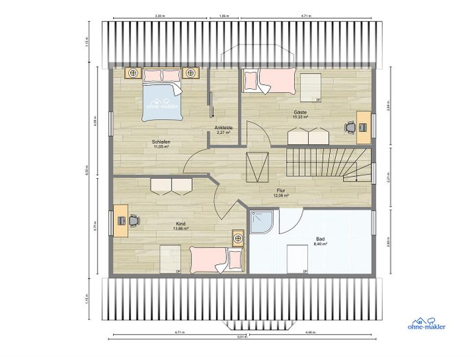 Im Obergeschoss erwarten Sie drei Schlafzimmer, von denen eines über einen begehbaren Kleiderschrank verfügt. Ein helles Vollbad sowie ein Gäste-WC mit Dusche im Erdgeschoss bieten zusätzlichen Komfort. Die moderne Einbauküche mit Kücheninsel lädt zum gemeinsamen Kochen und Genießen ein, während ein Hauswirtschaftsraum und ein großer Dachboden für Ordnung und Stauraum sorgen.
