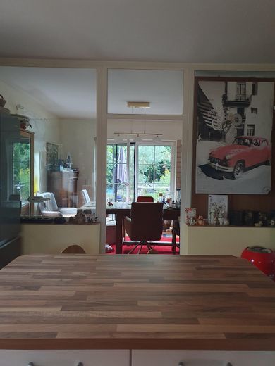 Die Küche ist vollständig ausgestattet und bietet mit moderner Technik und einer zentralen Kücheninsel viel Platz für gemeinsames Kochen. Ein besonderes Highlight ist die maßangefertigte Massivholz-Eichentür, die den Wohnbereich stilvoll abgrenzt und dem Haus eine elegante Note verleiht.