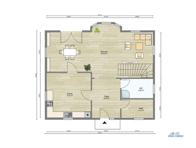 Auch der Eingangsbereich empfängt Sie herzlich: Die gesamte Vorderseite des Hauses ist überdacht – so treten Sie bei jedem Wetter trocken ins Haus, wo sie sofort ein großzügiger Flur willkommen heißt.