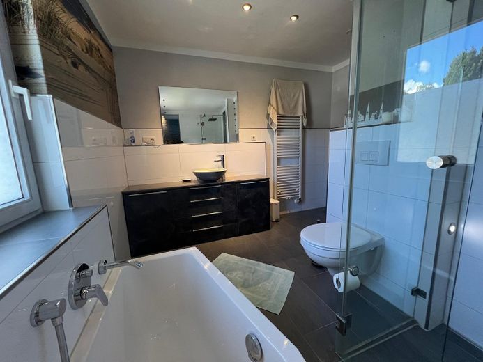 mit Wanne und separater Dusche inklusive Regendusche. Hochwertige Fliesen, ein großes