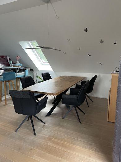 Großzügiger Wohnbereich mit elektrisch steuerbaren Velux Dachfenstern mit Rollos.