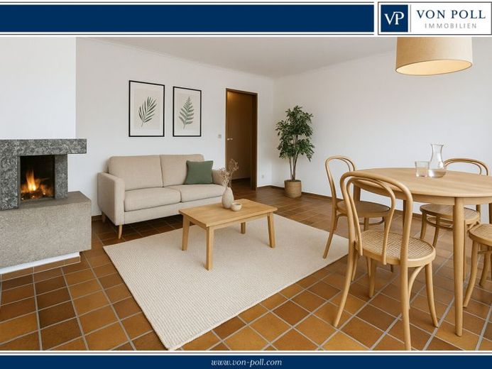 Das großzügige Wohnzimmer mit Kamin bildet das Herzstück der Wohnung. Große Fensterflächen lassen viel Tageslicht herein und schaffen eine freundliche, einladende Atmosphäre. Vom Wohnbereich aus gelangen Sie auf den Balkon mit Blick ins Grüne. Ausgestattet mit einer Markise lädt dieser zum Verweilen, Entspannen oder zu geselligen Stunden im Freien ein.