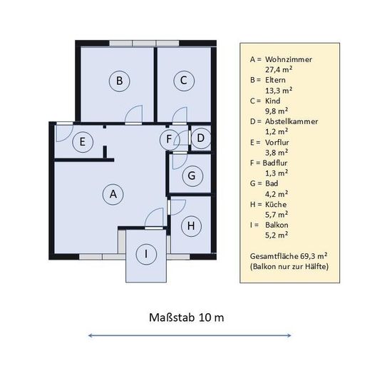 Zwischen Haustür und Wohnungstür im zweiten Obergeschoss liegen 37 Treppenstufen. Der Eingangsbereich der Wohnung bietet ausreichend Platz für eine Garderobe und geht offen in einen Wohnzimmer/Esszimmer/Flurbereich über. Das großzügige Wohnzimmer wirkt sehr hell und hat eine Fensterfront nach Westen mit Zugang zum Balkon. Abseits der Straße kann man dort den Blick auf den Rasen und die Bäume im rückwärtigen Grundstücksbereich genießen. Eine elektrisch angetriebene Markise kann als Sonnenschutz ausgefahren werden. Zur Straßenseite (Ostseite, Torfweg) liegen die beiden Schlafzimmer (im Grundriss mit „Eltern“ und Kind“ bezeichnet). Durch die Dreifachverglasung dieser Seite dringt aber kaum Lärm hinein. Das innenliegende Bad ist mit Toilette, Waschbecken und Dusche ausgestattet und hat kein Fenster (aber Ablüfter). Die sehr helle Küche mit großen Eckfenstern ist mit Einbaumöbeln sowie Waschmaschine, Kühlschrank, Backofen, Herd und Abzughaube ausgestattet. Für Staubsauger, Bügelbrett, Getränkekisten etc. gibt es eine kleine Abstellkammer.