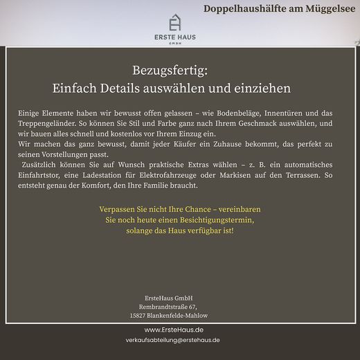 Vereinbaren Sie jetzt einen Besichtigungstermin und sichern Sie sich Ihr neues Zuhause am Müggelsee – provisionsfrei direkt vom Bauträger.