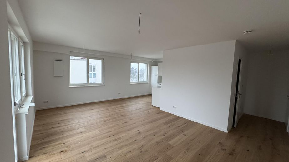 Die offene Wohnküche ist das Herz der Wohnung – mit einer hochwertigen Einbauküche und Markengeräten, die Lust aufs Kochen machen. Großzügige Fenster tauchen die Räume in Tageslicht und schaffen eine warme, freundliche Atmosphäre.