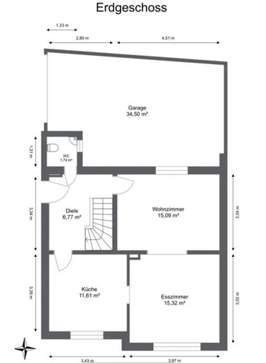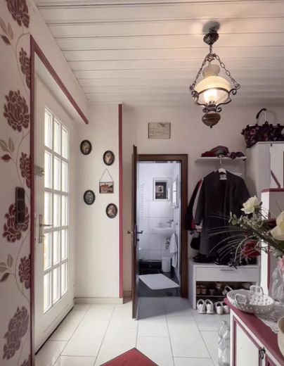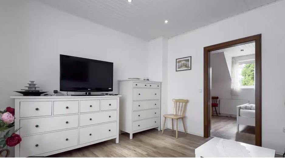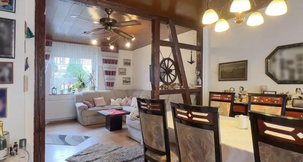 Im Erdgeschoss befinden sich ein einladender Flur, ein modernisiertes Gäste-WC, eine helle Wohnstube sowie ein großzügiger Wohn- und Essbereich, der durch Fachwerk stilvoll unterteilt ist.