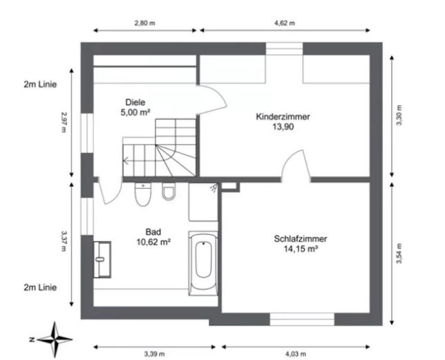 Im Obergeschoss liegen das Hauptbad mit Dusche, Wanne und WC, ein Schlafzimmer sowie ein weiteres Zimmer, das sich gut als Kinder-, Gäste- oder Arbeitszimmer eignet. Der Dachboden bietet zusätzlichen Stauraum.