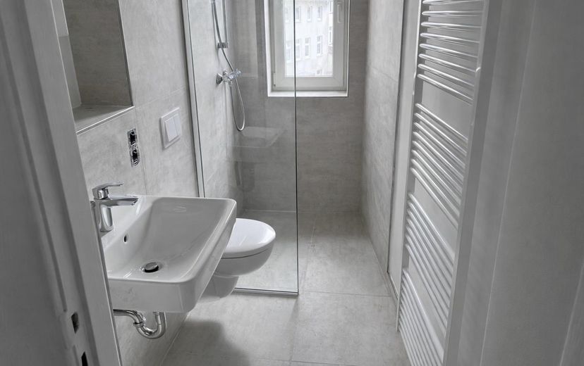 Das Badezimmer ist komplett neu gestaltet und mit großformatigen, modernen Fliesen in einem warmen Grau-Beige-Ton ausgestattet. Es verfügt über ein Fenster, eine bodengleiche Walk-in-Dusche, ein neues WC sowie einen Handtuchheizkörper.