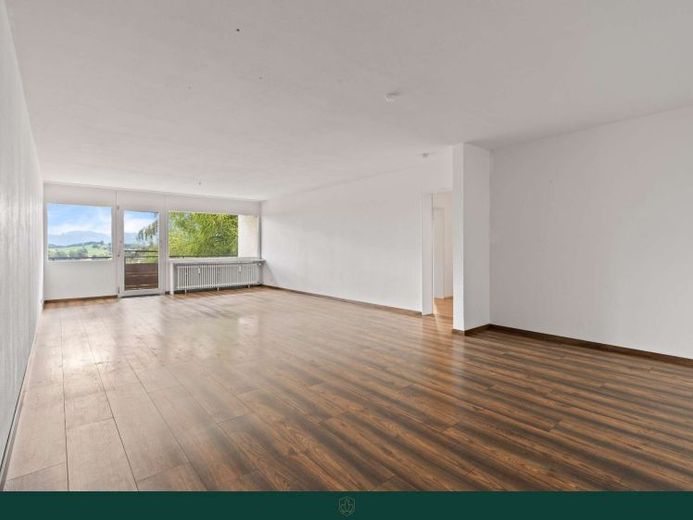Herzstück ist das helle Wohn- und Esszimmer mit Zugang zur Ostloggia mit Blick auf Nesselwang und die Berge.