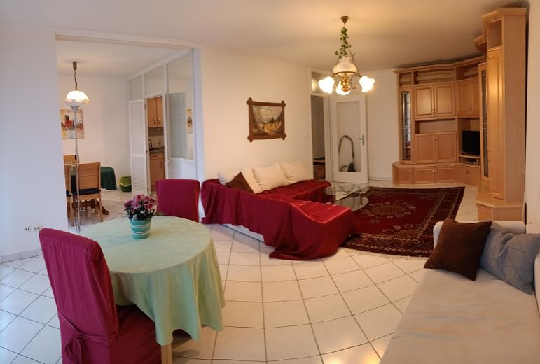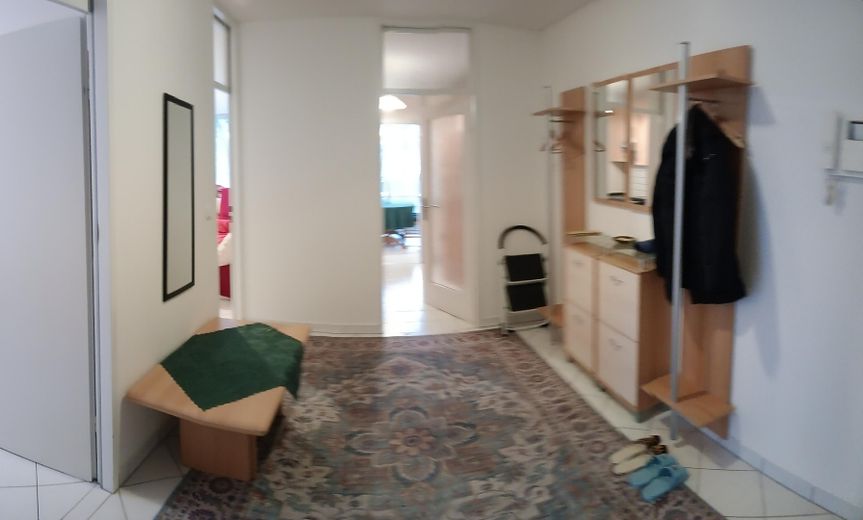 gut gepflegte 3,5 Zimmer-Wohnung mit großem Wohnzimmer und großer Diele. 2 WC. Alle Zimmer sind hell mit Bodentieffenstern. Die ganze Wohnung ist gefliest, auch die Balkonen. leicht zu putzen und pflegen. Einbauküchen mit Cerankochfeld, Backofen und Geschirrspüler, Kühl- und Gefrierschrank, Microwelle, Kaffeemaschine, Kochtöpfe, Geschirr und Gläser. Eine Wasch- und Trockenmaschine. Auch Putzzeug und Staubsauger sind dabei.