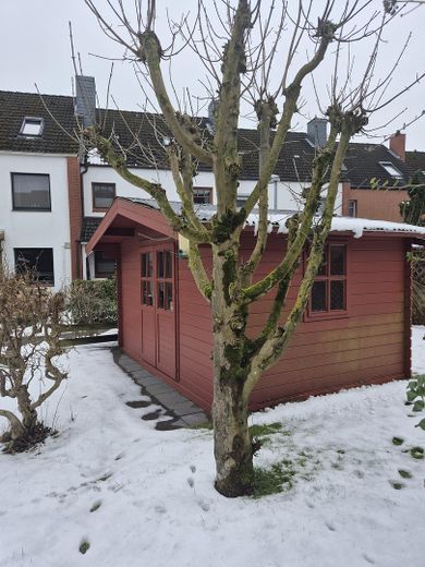 Vor dem Haus befindet sich noch ein kleiner Holzschuppen, der zur Aufbewahrung der Mülltonnen dient.