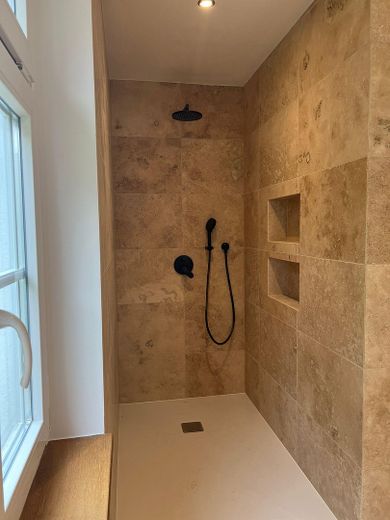 • Hochwertige Bodenbeläge: Travertinfliesen & Eiche-Landhausdielen (aktuell im Einbau)