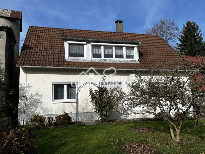 Einfamilienhaus mit Dachgeschoß ohne Keller 1966 gebaut. Im Laufe der Jahre Garagen, Abstellräume und Pergolen dazugebaut und renoviert. Guter Zustand. Ruhige Ortsrand-Lage. Große Wohnküche mit Einbauküche. Kachelofen mit Öl-Befeuerung und E-Öfen.
