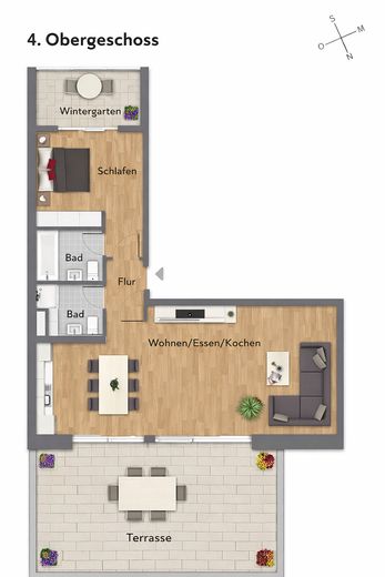Die 60 m² große Wohnung besteht aus einem großzügigen Wohnbereich mit Einbauküche und Essecke, einem Schlafzimmer, einem Bad, sowie Balkon.