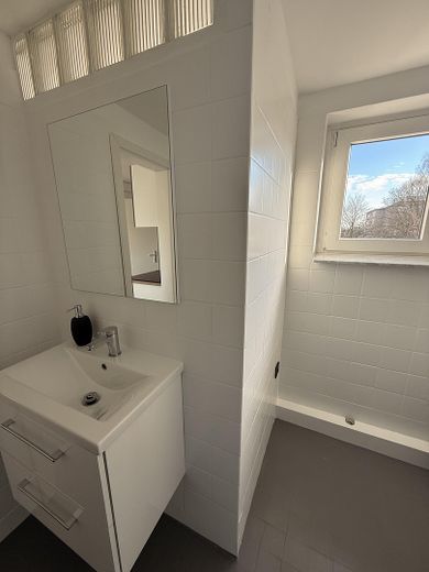 Das gepflegte Badezimmer verfügt über eine Dusche, WC, Waschbecken sowie Tageslicht und bietet somit zusätzlichen Komfort – ideal auch für längere Arbeitstage.