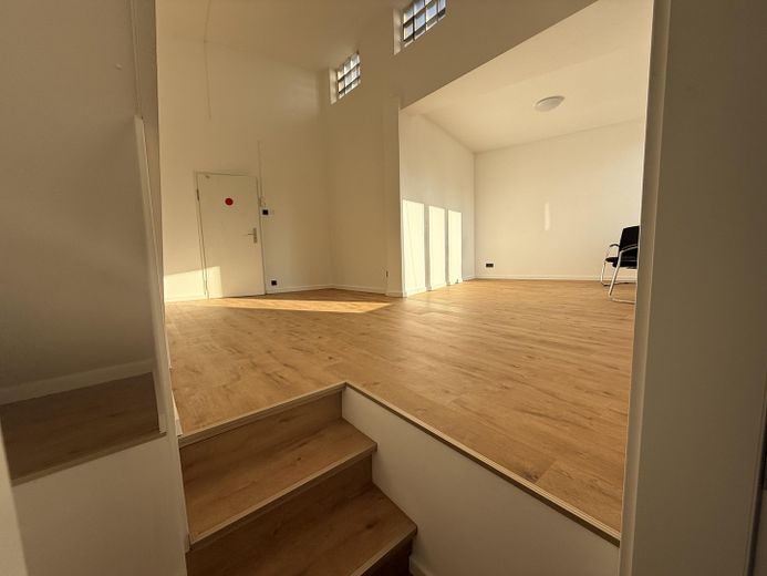 Der großzügige Hauptraum beeindruckt mit hohen Decken und großen Fensterflächen, die für viel Tageslicht und eine freundliche Arbeitsatmosphäre sorgen. Der hochwertige Vinyl-Boden verleiht dem Raum eine warme und repräsentative Ausstrahlung – ideal für Kundenempfang, Besprechungen oder offene Arbeitsplätze.