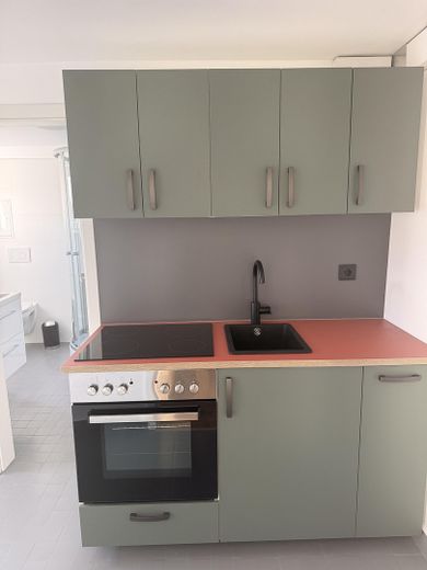 Die integrierte, moderne Teeküche ist funktional ausgestattet (Kochfeld, Backofen, Spüle, Stauraum) und fügt sich stilvoll in das Gesamtbild ein.