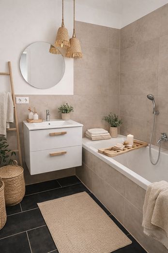 Ein weiteres Bad mit Badewanne und praktischen Anschlussmöglichkeiten für eine Waschmaschine rundet das Raumangebot ab und sorgt für zusätzlichen Komfort im Alltag.